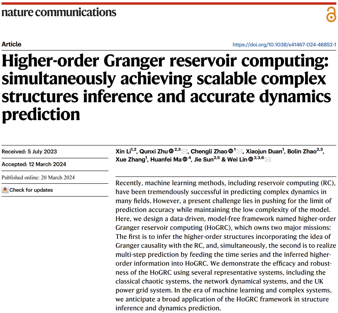 2024年3月20日,复旦大学林伟教授、朱群喜博士研究团队提出了一种基于格兰杰因果和储备池计算的轻量化机器学习框架,旨在高效且稳健地揭示系统高阶相互作用,并利用这些高阶结构信息进行精准动力学预测。这一研究成果以“Higher-order Granger reservoir computing: Simultaneously achieving scalable complex structures inference and accurate dynamics prediction”为题,在《自然通讯》杂志上发表。国际知名学术网站techxplore.com以“Lightweight machine learning method enhances scalable structural inference and dynamic prediction accuracy”为题专文推送了该工作的介绍。